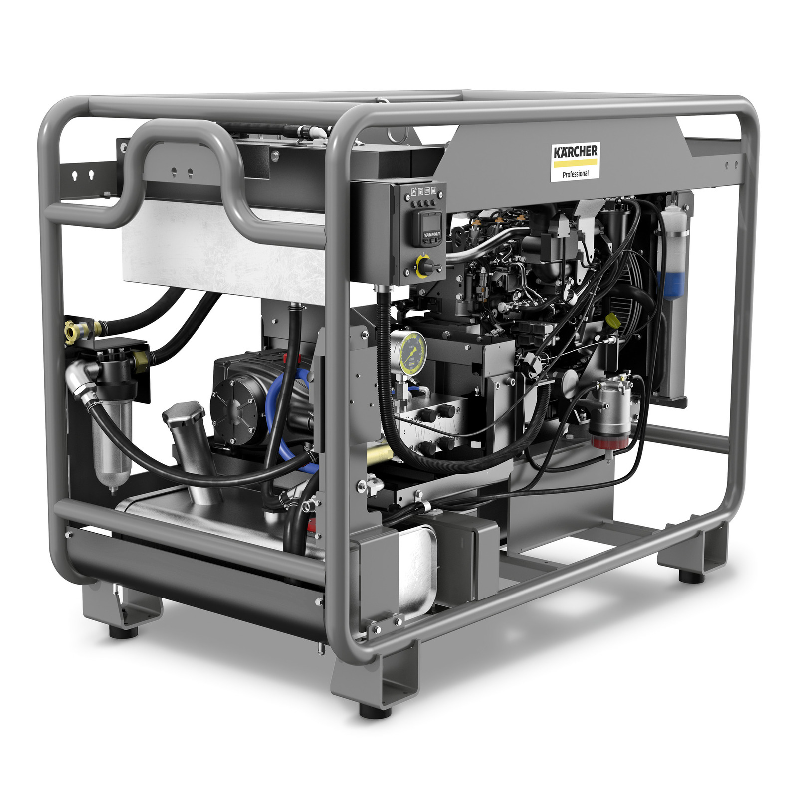 De HD 9/100 De Skid Advanced van Kärcher heeft een frame, boosterpomp, watertank, en een krachtige Stage V dieselmotor. De machine is een zelfvoorzienende hogedrukreiniger.